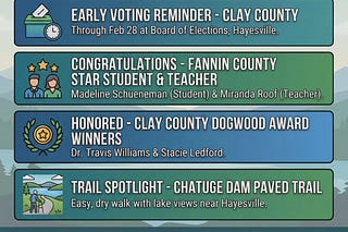 Your Saturday update with the final days of Clay County early voting, local honors for Fannin students and Clay recovery leaders, a rain-proof paved…