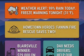 Fannin firefighters save two, a lucky neighbor wins big in Blairsville, and rain turns to ice across the region.
